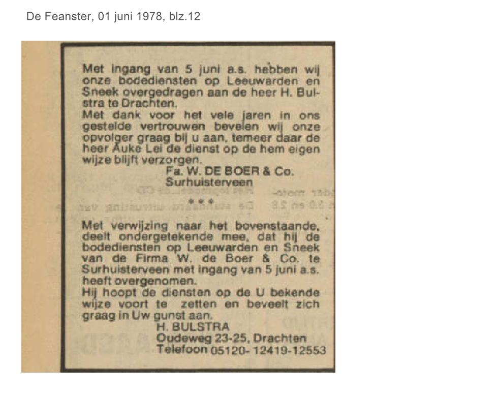 | Boer, de - bodediensten over naar Bulstra Drachten | juni | 1978 01-06 |