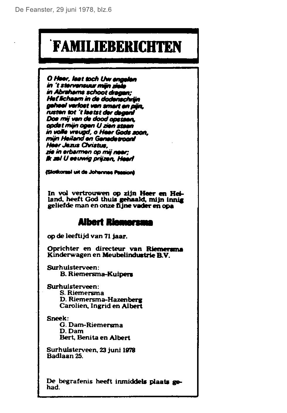 | Riemersma , Albert - stichter kinderwagenfabriek overleden | juni | 1978 29-06 b |
