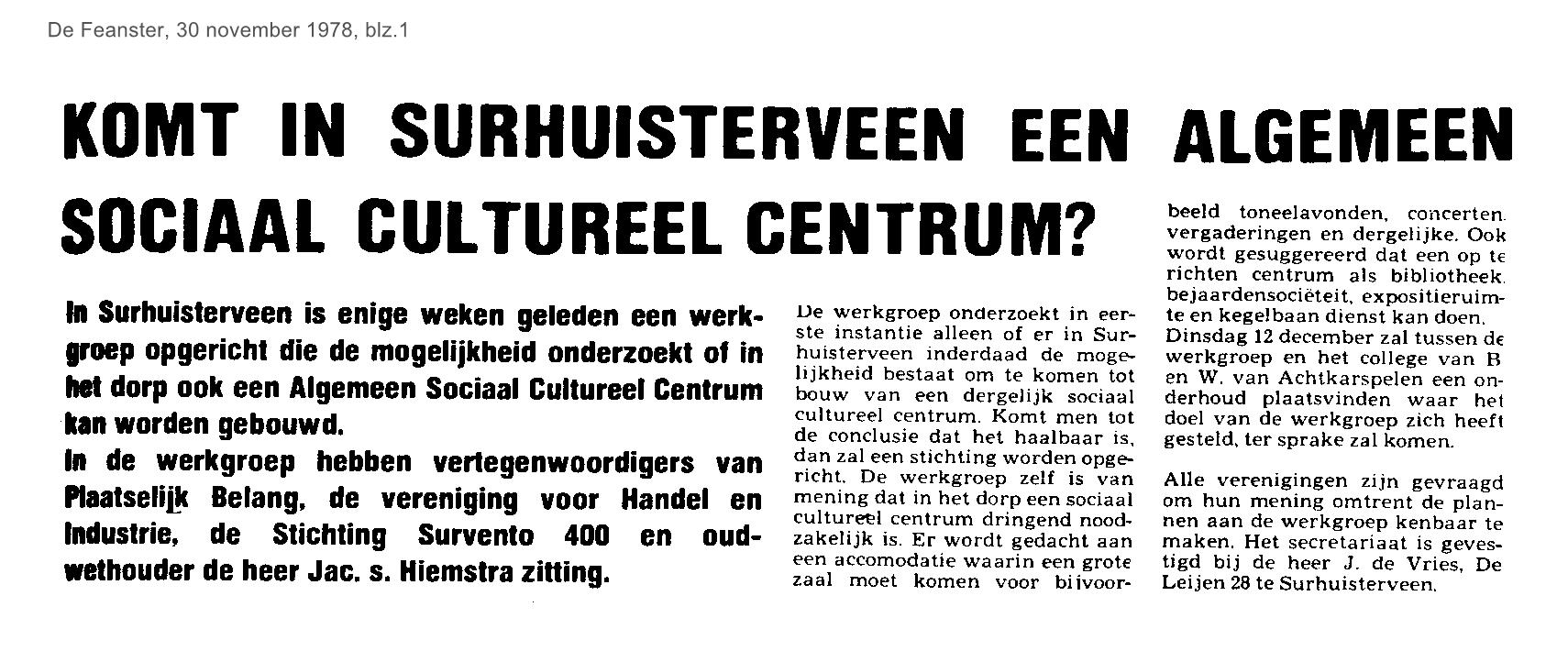 | Sociaal Cultureel Centrum in Surhuisterveen ?? | november | 1978 30-11 |