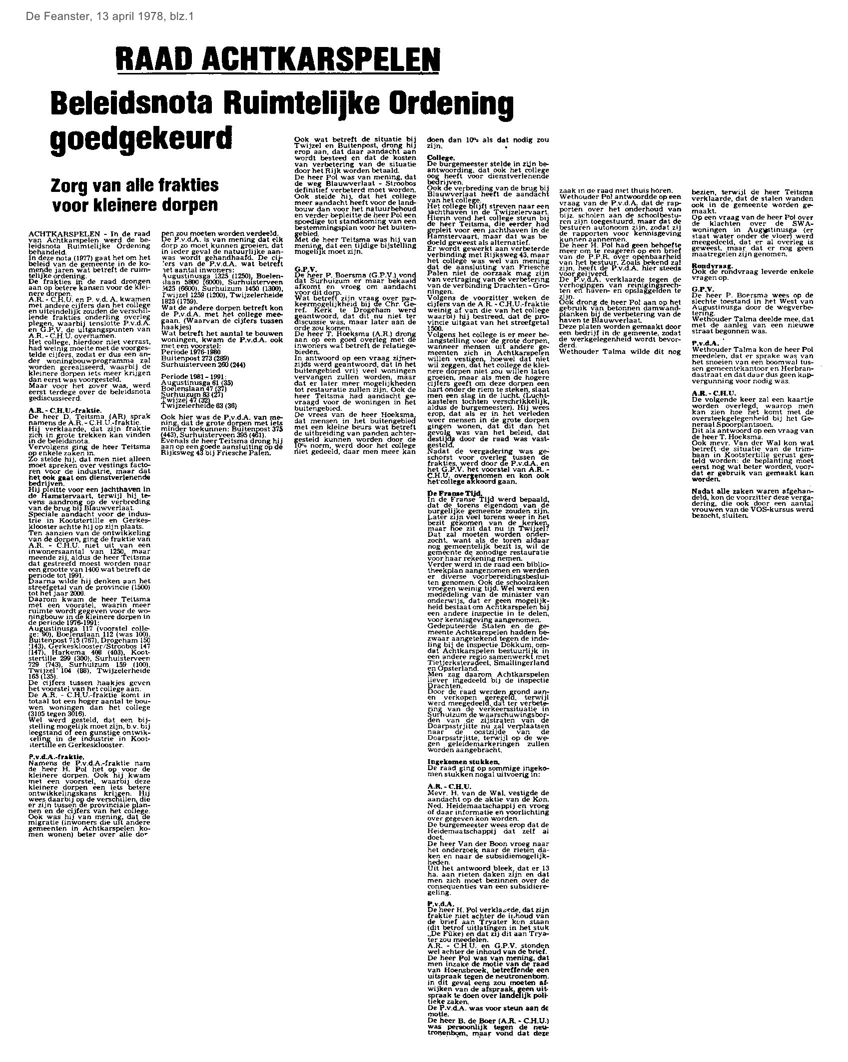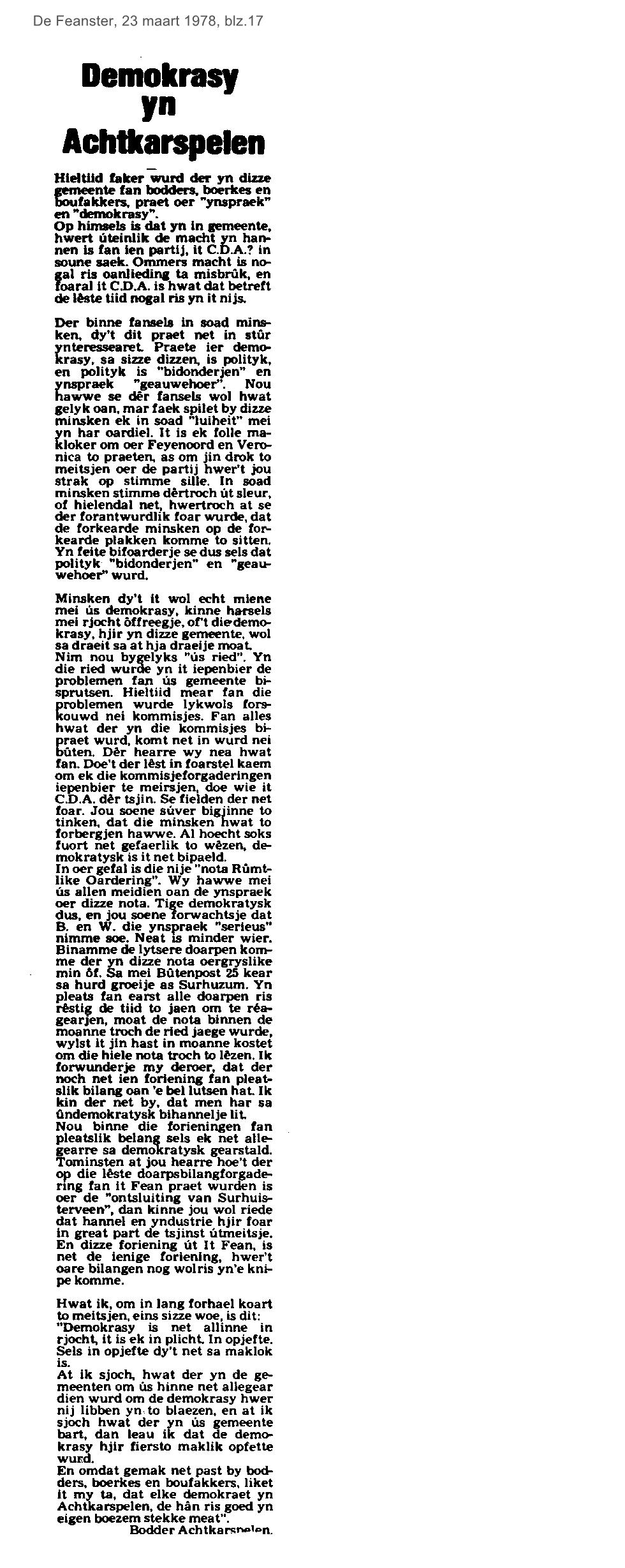 | Democratie in Achtkarspelen ( pl. Belang of H&I ) | maart | 1978 23-03 |