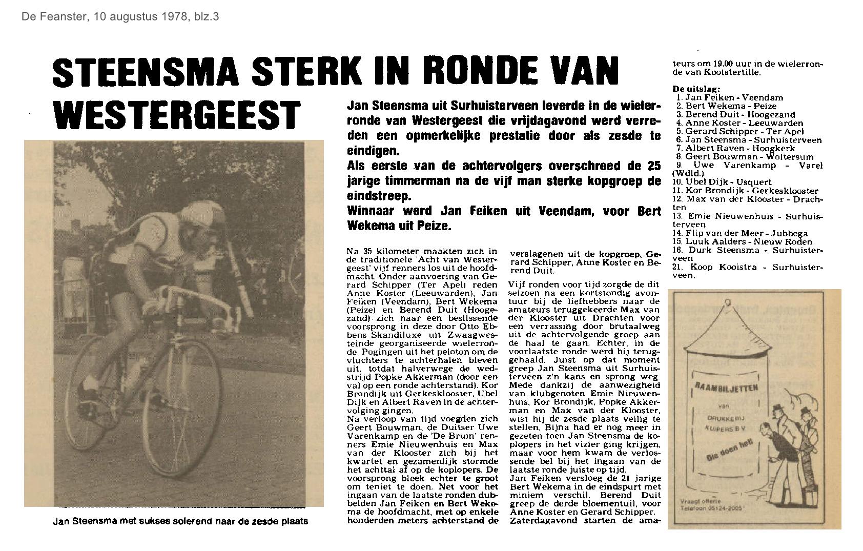 | Steensma, Jan - wielrenner is sterk in ronde van Westergeest | augustus | 1978 10-08 a |