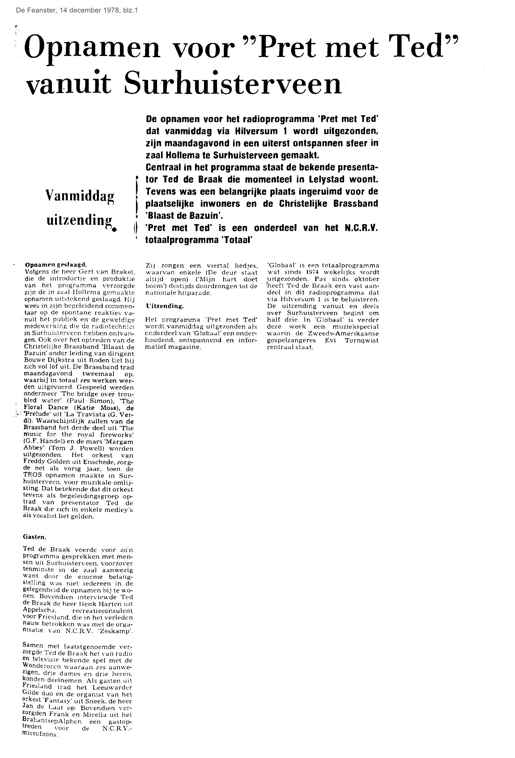 | Ted de Braak - ( van radio en tv ) “Pret met Ted ‘ in Surhuisterveen | december | 1978 07-12 a + 1978 14-12 |