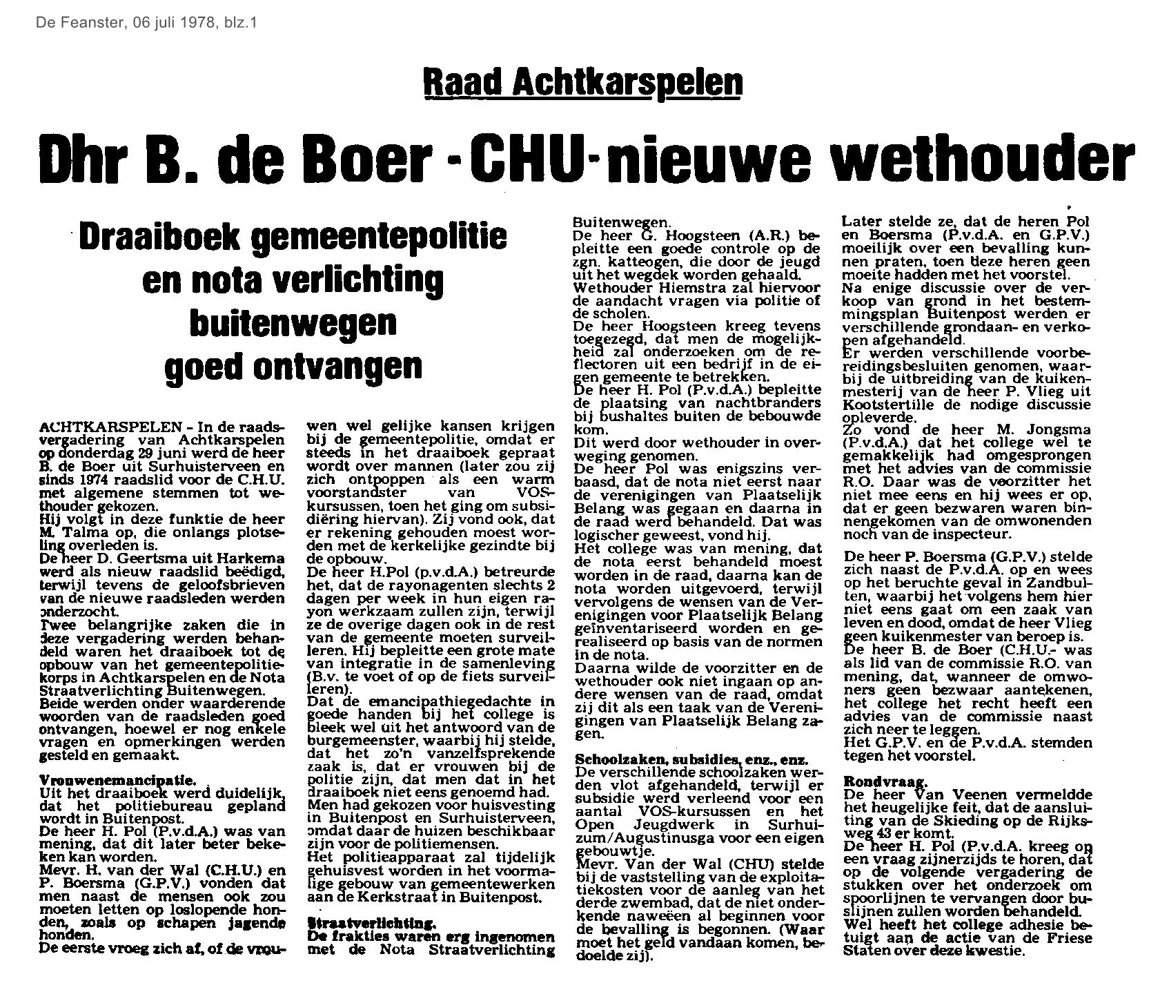 | Boer, B. de - nieuwe wethouder CH in Achtkarspelen | juni | 1978 06-07 |